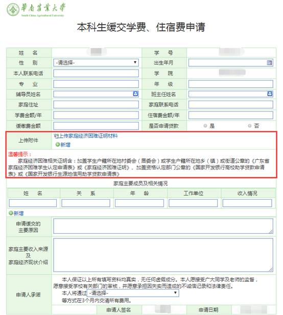 学生如实填写下图相应信息,其中“上传家庭经济困难证明材料”可以为:加盖学生户籍所在地村委会(居委会)或学生户籍所在地乡(镇)或街道公章的《广东省家庭经济困难学生认定申请表》或《家庭经济困难证明》、加盖资格认定部门公章的《国家开发银行高校助学贷款申请表》或《国家开发银行生源地信用助学贷款申请表》。