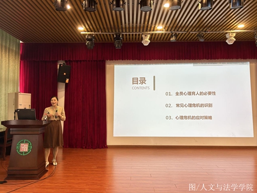 学校心理健康中心刘桂娥老师做主题为“大学生心理危机的识别与应对”的专题讲座。刘桂娥以现代人心理健康状况为引,以数据为佐证,强调心理健康的重要性和当下心理健康工作的形势,并从全员心理育人的必要性、常见心理危机的识别以及心理危机的应对策略展开,呼吁广大教师关注心理健康,提高心理抗压能力。