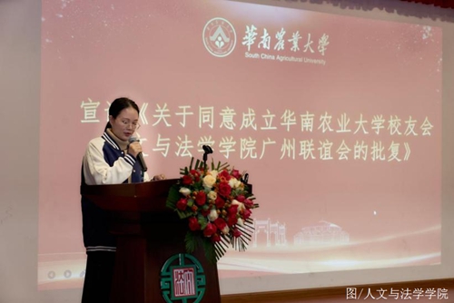 华南农业大学校友会李思思老师宣读《关于同意成立华南农业大学校友会人文与法学学院广州联谊会的批复》。她表示,希望筹备组践行母校“修德、博学、求实、创新”的校训精神,建设互助友爱、科学持续的交流共享平台,增进校友间联谊,整合学科与行业资源,协同创新,服务广大校友,服务学科与地区发展,为推动社会进步、助力母校和校友共同发展作贡献。