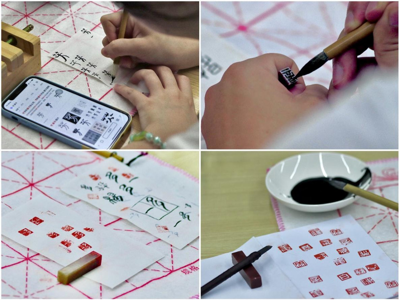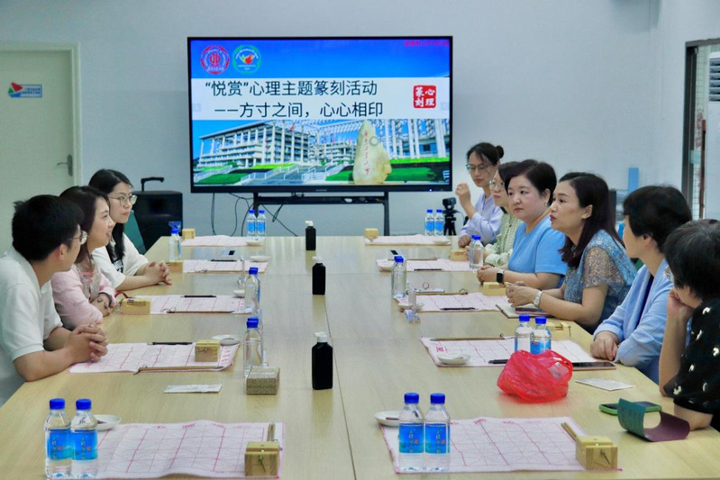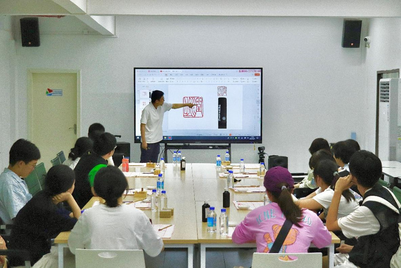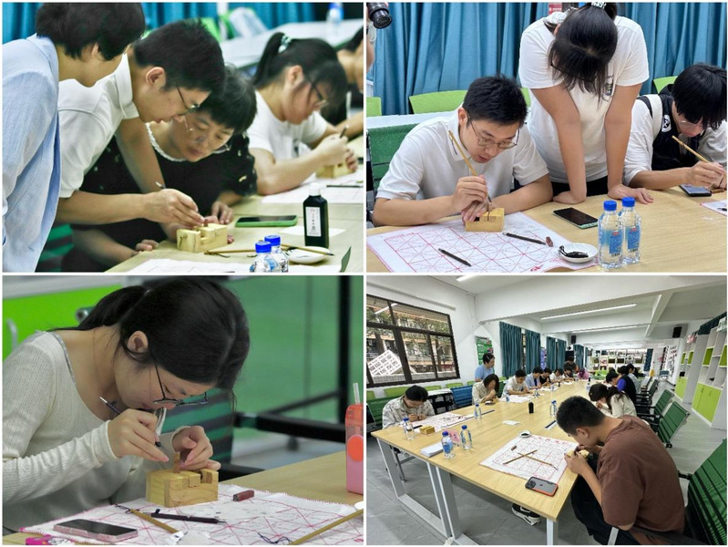 随后,申佐佐以“方寸之间的艺术——篆刻”为主题,从篆刻艺术的历史渊源、技艺特点以及与传统文化之间的联系展开介绍。现场展示了刻印工具和制作过程,并示范篆刻的刀法和技巧。在申老师的耐心指导下,师生们全身心投入到自己的一方天地,专注思考、设计印稿、认真雕刻、相互交流,现场活动气氛热烈。