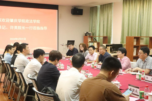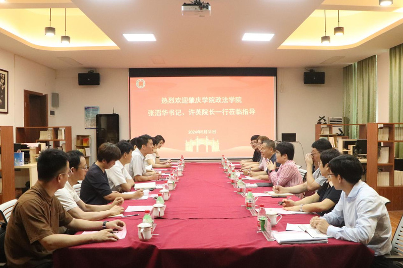 5月31日上午9点30分,肇庆学院政法学院党委书记张滔华、院长许英、党委副书记罗江鹏、副院长汪聂才等十人赴我院调研交流。本次座谈会在人文与法学学院7号院楼 110 室召开,党委书记陈晓东、党委副书记肖蕙、院长杨正喜等学院领导班子及法学系教师等参加了座谈会。学院党委副书记肖蕙主持本次座谈会。