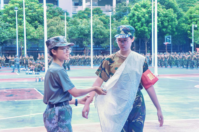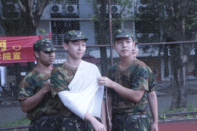 9月14日下午,学员们于启林北训练场进行了医疗急救培训。培训现场,教官向学员们教授了三角巾包扎法的医疗急救手段,详细地讲解了绞紧止血法、双胸包扎法、手臂骨折固定三种包扎方式的要点,并向学员们演示了整个包扎过程。学员们全神贯注地学习完理论知识后,两两一组互相为模特,积极进行实际操作,仔细体会其中每一步的要领,在实践中掌握三角巾包扎法。