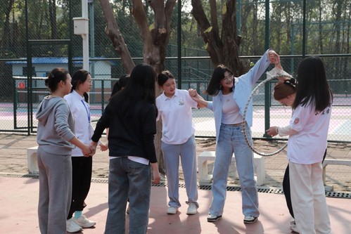 环环相扣项目中,同学们手拉手连成一条线,呼啦圈在队伍中灵活穿梭,考验着团队的协作与默契。