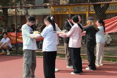 玉箸拈珠赛场上,同学们托举排球,横向奔跑,接力往返,排球在空中划出一道道优美的弧线。