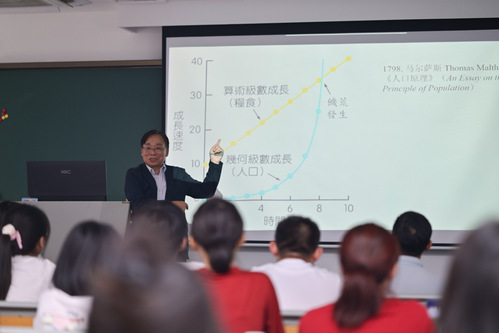 讲座伊始,张教授提出了讲座中心问题:“明清中国有粮食危机吗?”接着张教授向我们解释何谓粮食危机,并指出明清时期很多时候并非存在粮食不足,而是粮食过剩的问题,传统中国大多数人口是农民,他们以稻米贸易为生,粮食过剩对他们而言意味着灾难。接下来张教授引出马尔萨斯人口理论,向我们解释直接将该理论套用到明清中国社会的各种问题。