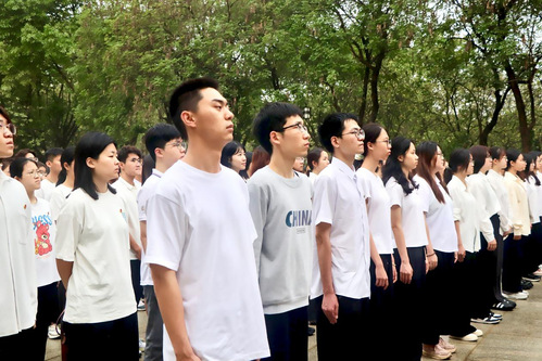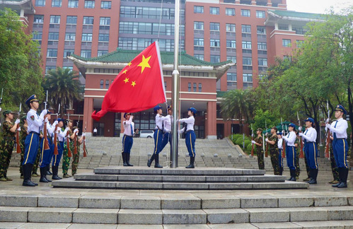 国旗护卫队以铿锵正步护卫五星红旗庄严走向升旗台,伴随着《义勇军进行曲》庄严奏响,擎旗手振臂扬旗,五星红旗迎着朝晖冉冉升起,全体师生肃立注目,高唱国歌,以崇高礼仪展现赤子丹心。