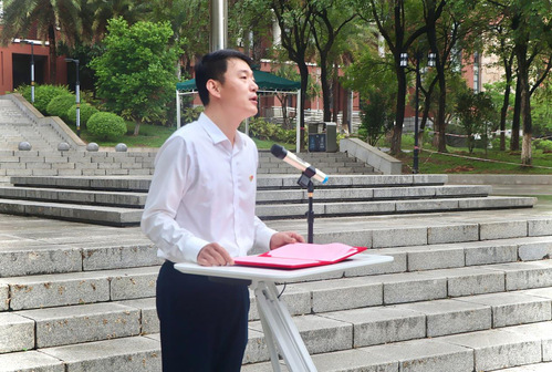 为激发青年学子爱国情怀、厚植责任担当,以青春之名致敬红旗、以热血之心赓续红色基因,我院于4月28日在行政楼广场隆重举行“青春礼赞,红旗飘扬”升旗仪式暨“国旗下成长”主题活动。学院党委委员、三办主任、全体辅导员、华南农业大学党委党校第99期入党积极分子培训班暨第17期发展对象培训班(人文与法学学院党委党校)学员、学院教官团成员等200余人共同参与,活动由人文与法学学院执行院长杨正喜主持。