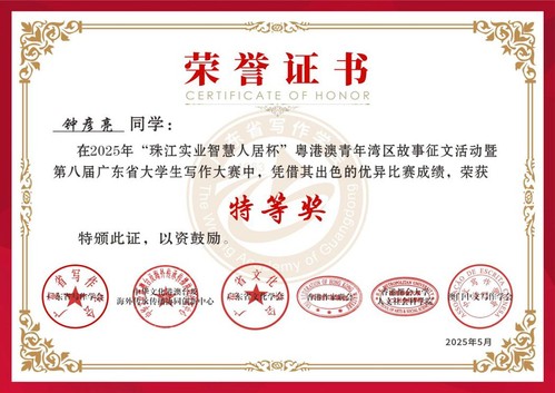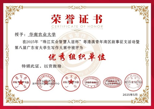 日前,由广东省写作学会、暨南大学中华文化港澳台及海外传承传播协同创新中心、广东省文化学会、香港作家联会、香港都会大学人文社会科学院、澳门中文写作学会联合主办的“珠江实业智慧人居杯”粤港澳青年湾区故事征文活动暨第八届广东省大学生写作大赛圆满收官。这场以“讲好中国故事”为宗旨的文学盛事,吸引了来自全国近120所高校的近10万学子参赛。华南农业大学学子荣获一等奖8项,二等12项,三等奖20项,我校2019届毕业生钟彦亮因写作成就获得本次比赛特等奖。我校亦荣膺“优秀组织单位”奖,18位教师获得广东省写作学会颁发的“优秀指导教师”证书。