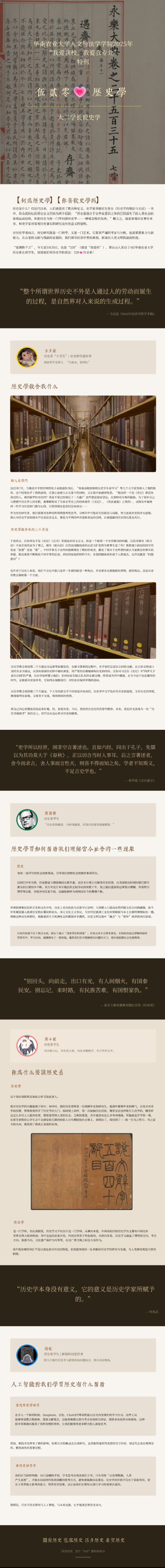 为了在高考招生中积极宣传我院,提高2025年招生工作质量,激发我院学生爱学院、爱专业的创作热情,发掘能够体现华南农业大学人文与法学学院专业特色的优秀文化作品,华南农业大学人文与法学学院党委信息中心于2025年4月17日至5月12日面向学院全体学生举办了人文与法学学院2025年“我爱我校,我爱我专业”主题作品征集活动,以下为历史学专业应征作品展示。