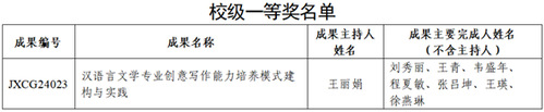 由王丽娟教授主持申报的“汉语言文学专业创意写作能力培养模式建构与实践”成果获得了2024年度校级本科教学成果一等奖。