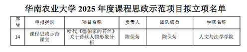 近日,学校公布了2025年度校级课程思政示范项目拟立项名单,我院陈保菊老师获得立项项目。