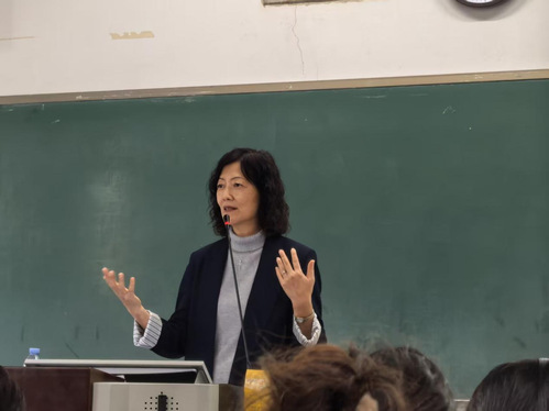 在讲座的师生交流环节,刘教授对自己在语言学方面的理解作出阐释。她指出,新兴词汇能存活多久仍需投入大量数据进行分析,并再次强调了词汇的灵活性及其时代特征。刘教授认为,影响因素还应包含非语言因素,即社会现象与需要。她希望大一新生能够培养学习语言学的兴趣,使学习变得既有趣又实用。刘教授的发言让现场师生深受启发。