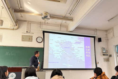 讲座伊始,徐松岩老师以自己的学术经历引入,介绍了古典学在中国的最新进展。随后,他深入阐述了古希腊文明的次生特质,提出西亚与北非的农业文明在古希腊文明发展过程中占据重要地位,强调东方文化的发展成果通过航运对希腊半岛的原住民产生了深远影响。徐老师指出,在希腊语词汇及希腊神话原型中存在大量外来文明特征。他现场展示了一系列包括克里特陶器、迈锡尼金面具、壁画等考古成果,有力论证了古希腊文明与西亚文明的深厚渊源。