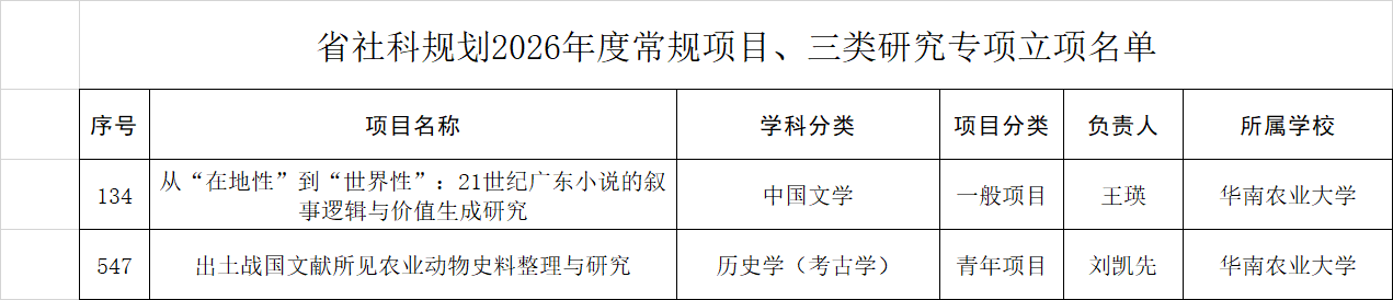 王瑛老师“从‘在地性’到‘世界性’:21世纪广东小说的叙事逻辑与价值生成研究”获得省社科2026年度一般项目立项,刘凯先老师“出土战国文献所见农业动物史料整理与研究”获得省社科2026年度青年项目立项。