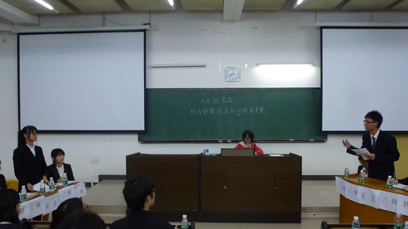 此次辩论的正方是食品学院党校辩论队,他们认为“知识扶贫比经济扶贫更重要”,反方为人文与法学学院党校辩论队他们认为“经济扶贫比知识扶贫更重要”。简单的自我介绍之后,双方一辩开篇陈词。正方一辩表示,经济扶贫诚然重要,但是“授人以鱼,不如授人以渔”,要从根本上解决贫困问题,还是得靠知识扶贫,经济扶贫只能解决短期问题,从长期来看,经济扶贫的效果不如知识扶贫。而反方一辩则表示,知识扶贫的重要性是不可否认的,但是,就中国目前的情况来看,经济扶贫显然比知识扶贫更重要。经济是基础,没有经济作为前提,知识扶贫根本无法开展。当前,我国贫困人群更迫切需要的是经济扶贫,经济扶贫的效果立竿见影。