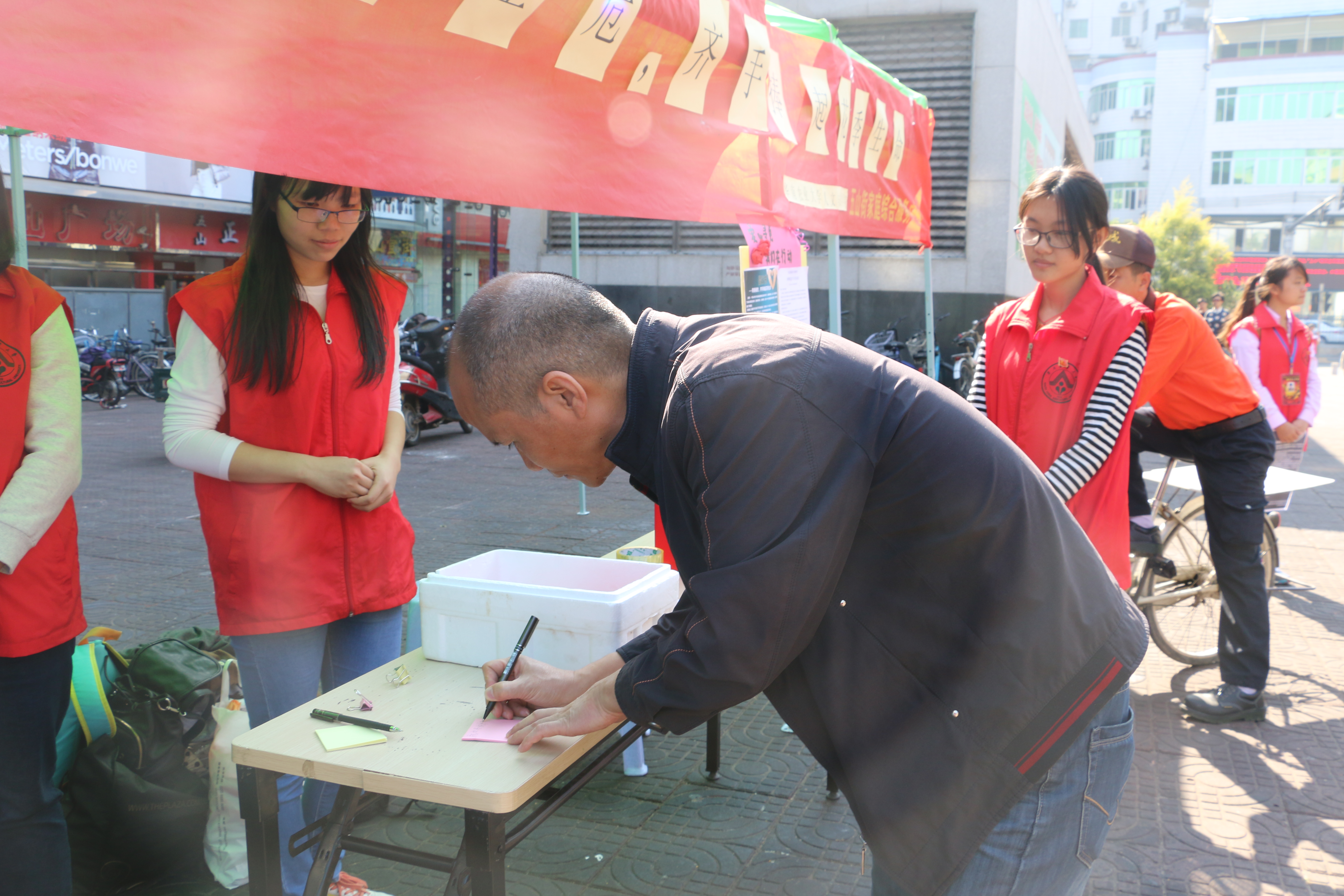 在长达13个小时的募捐中,工作人员都尽心尽力、毫无怨言地为粱观弟争取每一份爱心。据悉,在募捐过程中,工作人员得到了许许多多的帮助。“感谢各位善者,感谢摊位前折纸鹤的女孩,感谢为工作人员送水的大哥,感谢所有付出的工作人员,也感谢晚上赶来支援的团学干事”,负责人林建成如是说。笔者还了解到,该摊位使用的帐篷、桌子等物资均由五山街家庭综合服务中心无偿提供。