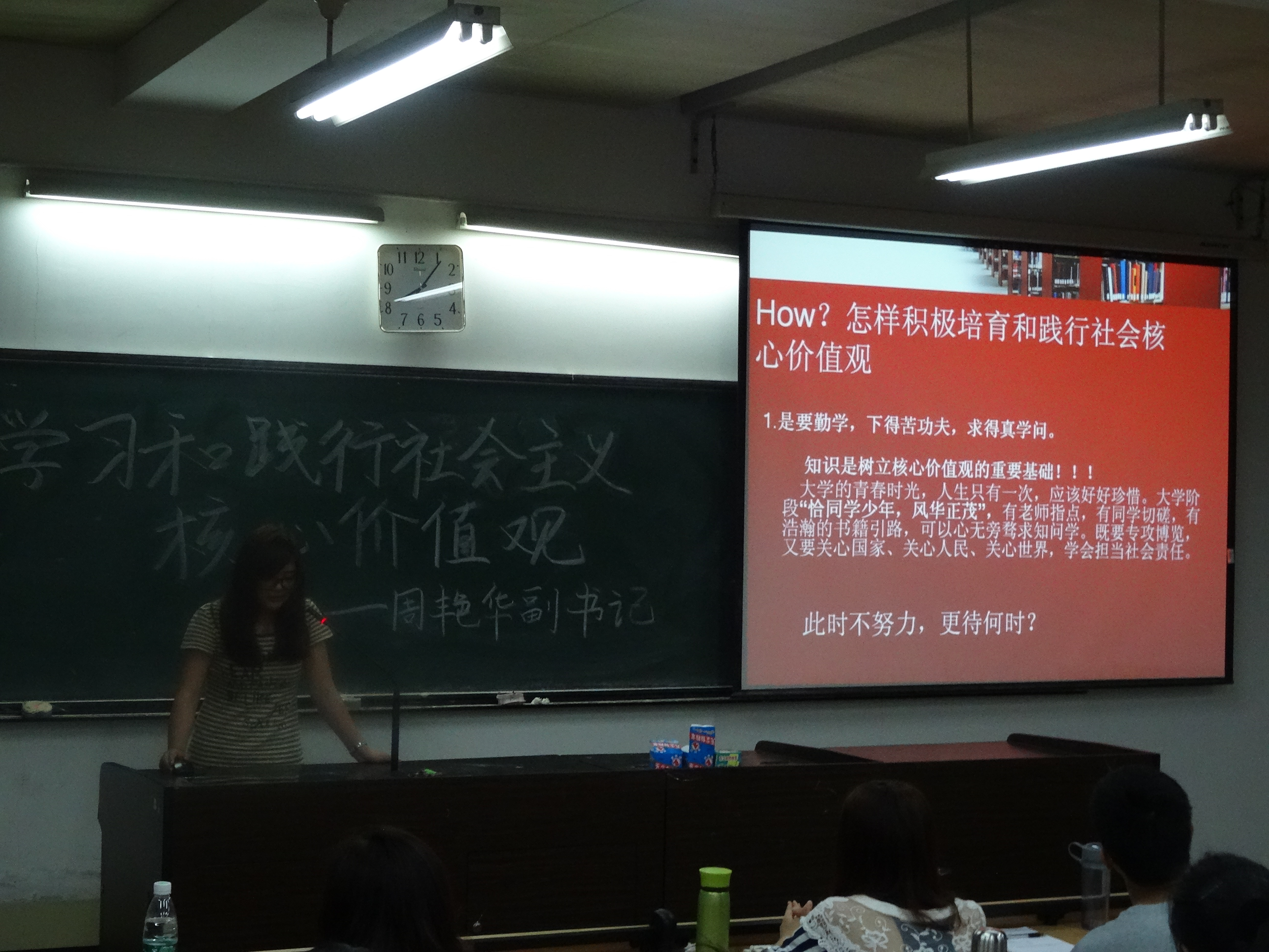 17日晚,我院在教三209举行了主题为“社会主义核心价值观与大学生”的党课。参加本期党课的有学院党委副书记周艳华、党务工作部指导老师吴迪、党务工作部相关工作人员以及到场的党校学员。