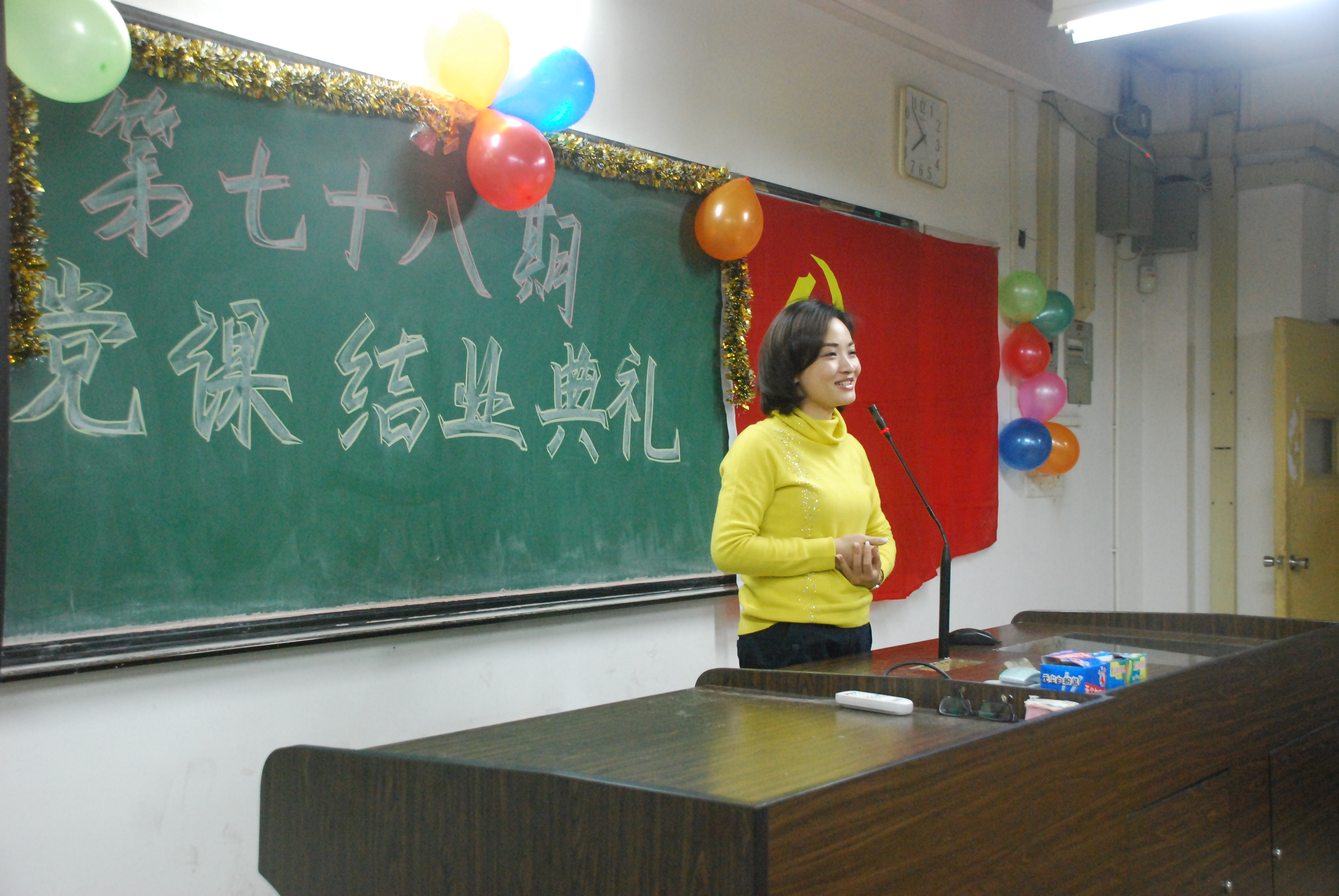 在结业典礼中,首先由学院党委副书记周艳华致辞。周书记在讲话中着重强调了志愿活动的重要性,她说:“党课学员们不仅要坚持学习,坚持实践,坚持自己的信仰,同时也要参加更多的,形式多样的,对自己的生活有帮助的志愿活动,要充分领悟并贯彻我院在党员党建工作上的中心思想--建设服务型基层党组织。”此外,周书记从学习、生活和如何向党组织靠拢三个方面提醒各党课学员要带着一颗认真学习的心,拥有一双细心观察的眼睛,重视群众基础,在班级体中起带头作用,在集体活动中充满热情,增强集体荣誉感,努力带动班集体不断向前。