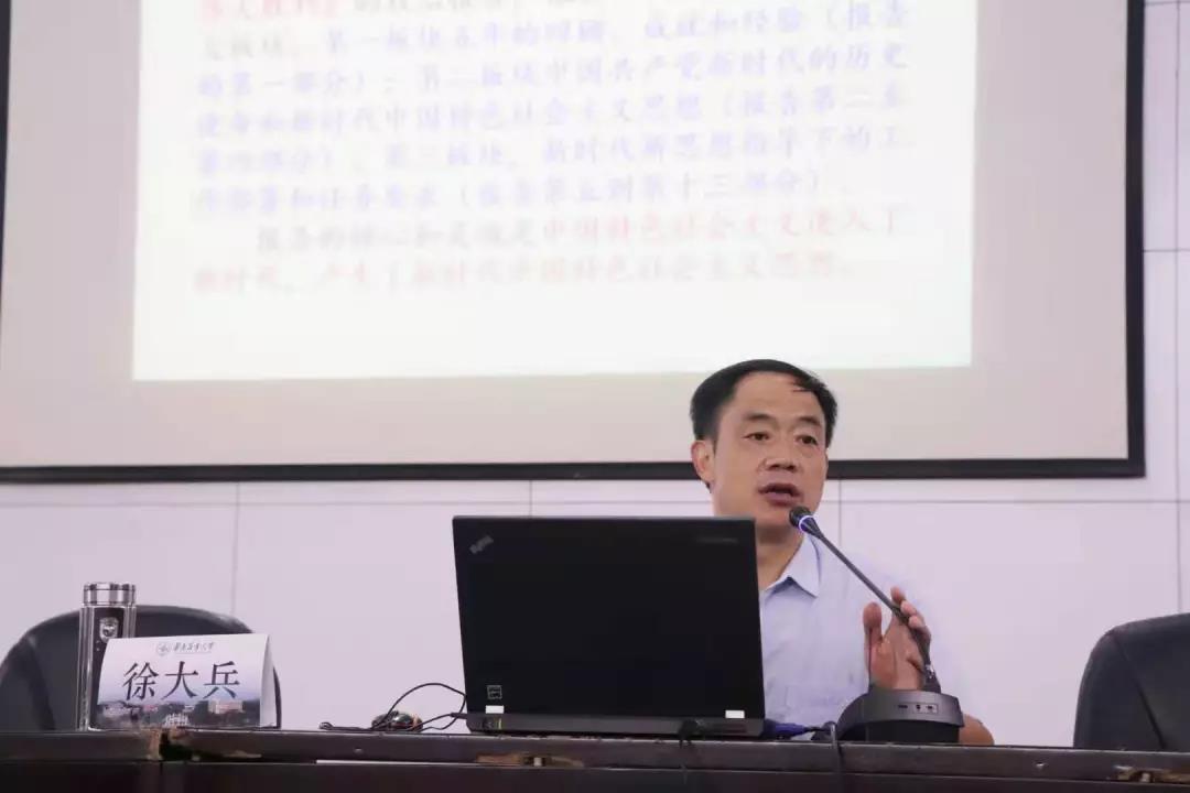 全体学员高唱国际歌后,徐大兵教授仔细分析习近平总书记在中国共产党第十九次全国代表大会上所作报告《决胜全面建成小康社会 夺取新时代中国特色社会主义伟大胜利》,以此引出本次党课主题“习近平新时代中国特色社会主义思想”。学员们全神贯注,认真听讲。