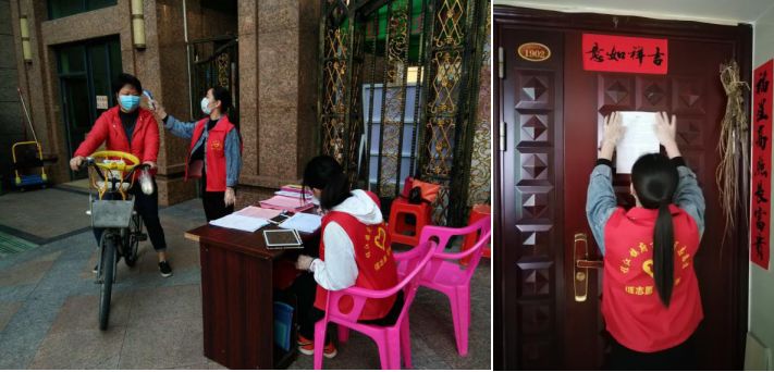 赖晶晶同学在为小区居民测量体温、张贴提示