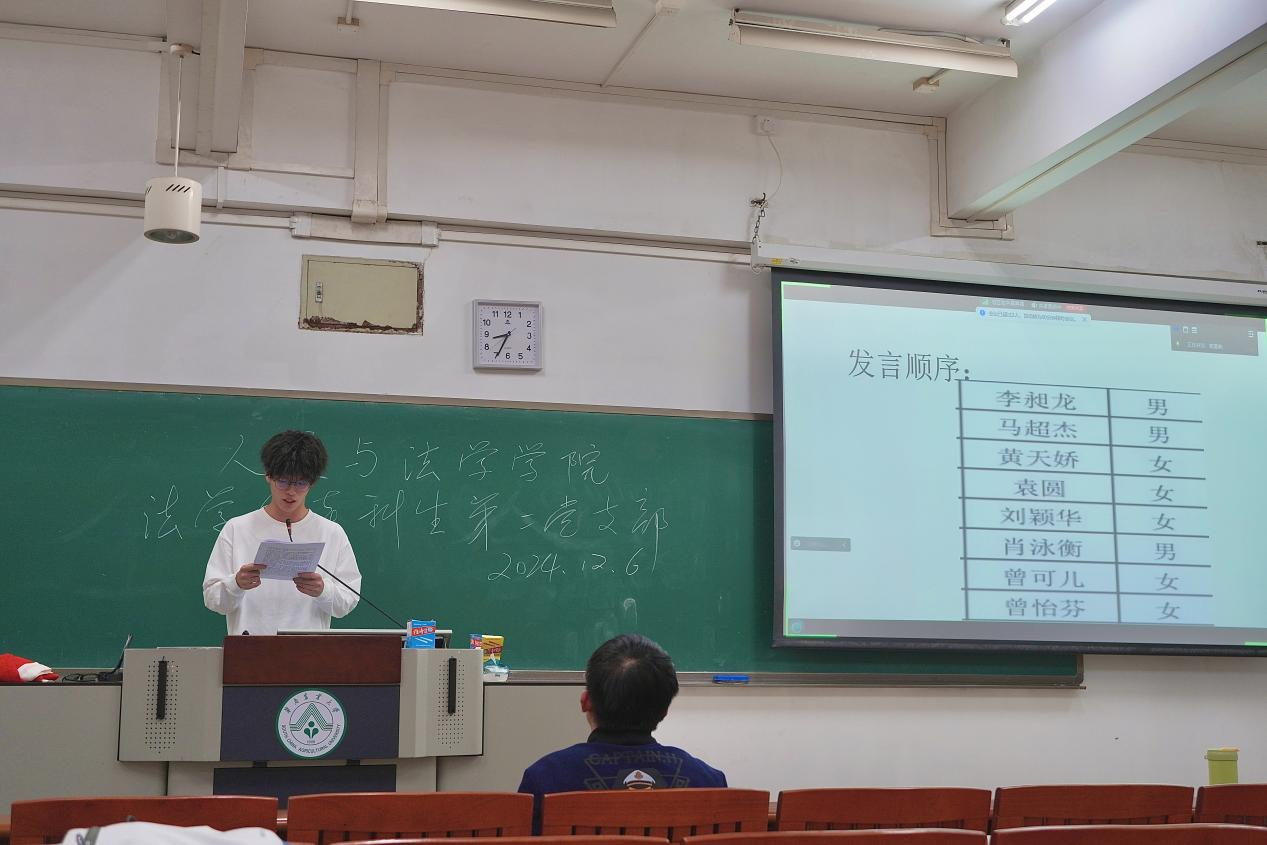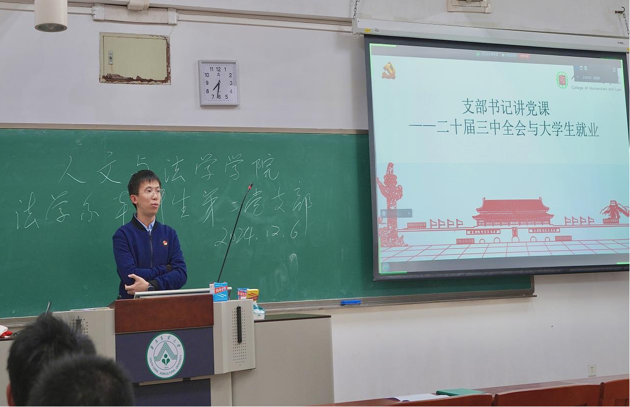 法学系本科生第二党支部于2024年12月6日晚在第五教学楼D栋204教室开展以“支部书记讲党课——二十届三中全会与大学生就业”为主题的党日活动,在书记李玮舜同志主持下,支部成员深入学习贯彻党的二十届三中全会精神。