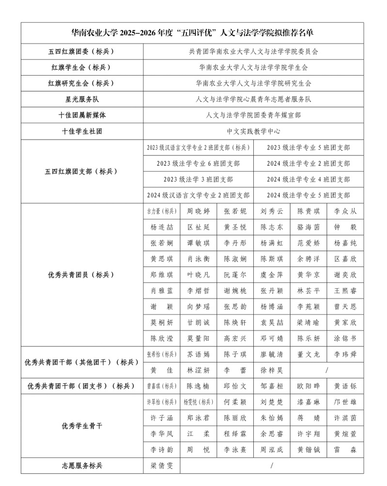 华南农业大学2025-2026年度“五四评优”人文与法学学院拟推荐名...
