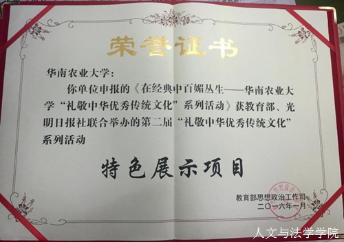 学院打造的“文化根•岭南韵•中国梦”、“在经典中百媚丛生”和“岭南风•民族魂•爱国行”三个项目分别于2014、2015、2016年连续三年获得教育部全国高校“礼敬中华优秀传统文化”系列活动“特色展示项目”,成为全省唯一一所连续三年获得此项目的高校。“中华状元红”知识竞技大赛在2013年广东高校校园文化建设评选中荣获三等奖;文渊阁夺得第八届广州大学生戏剧节“戏剧追求奖”、“优秀非职业戏剧人”以及第九届广州大学生戏剧节“综合表现力演出奖”及“优秀非职业戏剧人”、广东大学生话剧小品大赛三等奖;模拟法庭获第二届、第四届全国“捭阖杯”辩论挑战赛广东赛区冠军、广东省第二届大学生模拟法庭竞赛季军等荣誉。“诗韵华章•紫荆情”第四届紫荆华农诗词大会、中华状元红等品牌活动多次受到新华网、羊城晚报、中国诗歌网等知名媒体报道。