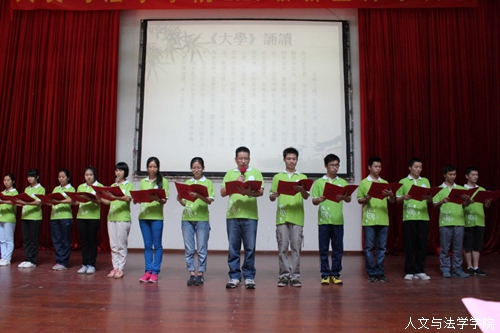 中华经典诵读工程旨在以诵读国学经典的形式,带领大学生了解中华传统文化经典,接受人文精神熏陶,不断提高学生的综合素质和人文素养。人文与法学学院国学院常务副院长唐元平带领鄱阳湖知行学园十余年来始终坚持传承国学经典文化,在传统文化节日、纪念日以及新生入学教育等时间节点上开展经典诵读活动,诵读内容囊括四书五经、唐诗宋词等中华经典。