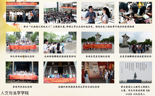 2016年,在校党委宣传部的统一部署下,在学工部、研工部、校团委等部门的指导下,人文与法学学院精心策划、积极组织,以“岭南风·民族魂·爱国行”为主题开展了一系列礼敬中华优秀传统文化活动,面向学校师生开展深入、生动和持久的爱国主义教育。通过行走岭南,传递爱国主义的信念和顽强拼搏的精神,促进广大师生对爱国主义精神内化于心,外践于行,增强大学生文化自信,培养具有爱国赤诚、文化自信和家国情怀的大学生。