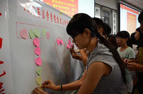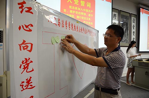 在红心向党送祝福环节,党员们在心形便利贴写下对党的祝福,学生党员赖嘉俊写道:“亲爱的党,生日快乐,一颗红心永向党,牢记使命,走向伟大复兴中国梦。一位教工党员也写道:“95年风雨,95年历程,敬爱的党我会一直拥护您,是您让我变得优秀。”