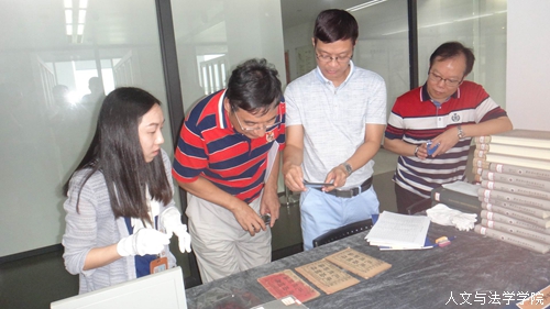 倪根金教授、张永忠局长(左3)在王柏全(左1)、詹宝莹(右1)陪同下观看木鱼书