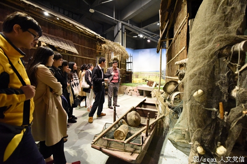 实践教学的第一站是东莞市沙田镇。在倪老师和黎馆长的引导下,研究生们首先参观了沙田水文化展览馆。其基本陈列《水上人家——沙田疍民民俗展》以沙田水文化为主题,通过史料展区、实景展区、文物展区、咸水歌展区、龙舟展区等五部分,系统展现了古今疍民的生活、劳作场景。馆内陈列疍家物品近500件,其中渔船、茅寮屋或是原物,或是按实物大小建造的。黎馆长现场讲解和倪老师的补充说明,使大家对莞草栽培历史、秧船使用方法、沙田河涌景观等有了形象、生动的认识。感受到了沙田疍家文化的丰富多彩。
