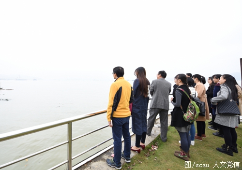 沙田镇位于在东江南支流和狮子洋交汇处,以前是汪洋一片。清中期后,外地人来此筑围造田,才逐渐成陆。在黎馆长的带领下,研究生们来到外海大堤上,听馆长讲述近二三十年陆地不断向狮子洋推进的变迁历史,让大家对沧海桑田巨变,特别是珠江三角洲变迁史有了更具体的认识,有了比看PPT图片更深刻的感受。