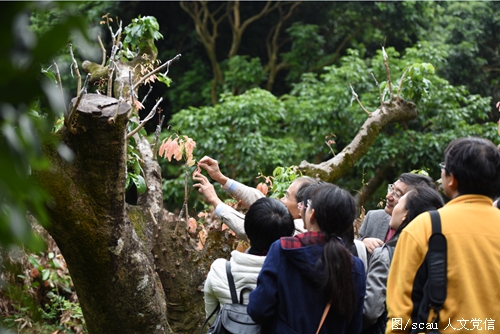 最后是观音山国家森林公园古树博物馆的实地教学。黑黑的古树,齐聚一堂,场面壮观。师生走进古树博物馆,探访黄帝时代、周、秦、汉、三国、唐、宋、明、清遗存的古树。据了解,青皮树是古树博物馆内最为古老、最具历史价值的珍藏,为黄帝时期的一棵树。它的存在,说明了黄帝时期广东中部潭江等地的气候相当于今天的海南省。古树博物馆之行,激发了同学们对中国环境史研究的兴趣,使大家对历史时期的森林植被分布与变迁有了更直观的理解,并对森林资源的保护有了更深刻的认识。