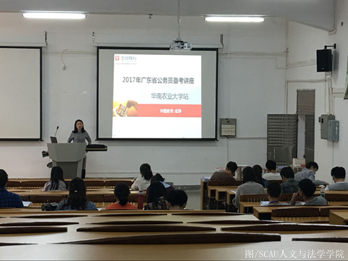 12月26日下午,人文与法学学院邀请华图教育的成琤老师在院楼101教室内开展了华南农业大学站2017年广东省公务员考试省考讲座。参加讲座的有人文学院以及其他学院的同学。