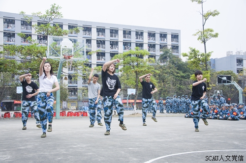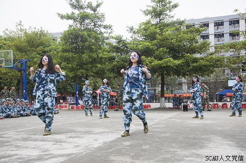 同学们席地而坐,虽无华美的灯光与豪华的音响设备,却丝毫没有减退大家的热情。同学们只把军装作红装,活力绽放,青春飞扬。特别是我营二连的那段独特的热舞,更是赢得阵阵掌声。