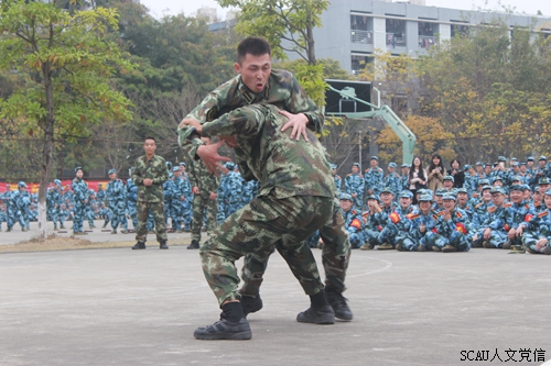 教官们的拳术表演将活动推向高潮,一抬手,一落地,一踢腿,一过摔,尽显军人气势。值得一提的是,这次拳术表演是教官们牺牲了几天休息时间准备的,拳拳寄予了教官对军训学子的激励,希望军训学子能够继续加油,咬牙坚持往后的训练。