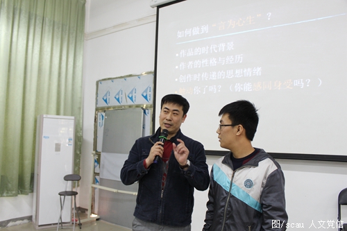 讲座中,牧言老师多次以情景模拟的形式与现场进行了积极互动,鼓励同学们上台表演,并现场进行指导。牧言老师还在现场播放经典朗诵视频:语言大师姚锡娟朗诵的《鸟与人》和徐涛朗诵的《面朝大海,春暖花开》,让同学们充分领略到朗诵艺术的魅力,赢得阵阵掌声。