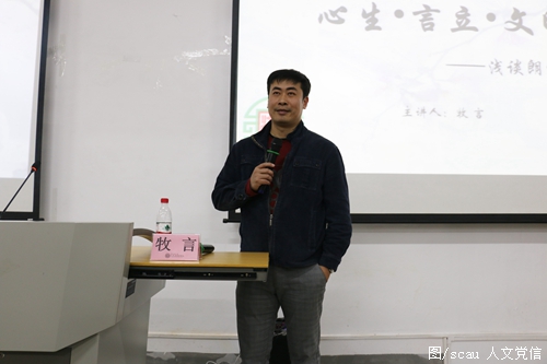 3月26日下午,中华文化促进会全国朗读专业委员会副主任、广东省朗诵协会常务副会长牧言先生受邀做客我校人文与法学学院集雅讲堂,在院楼101阶梯课室为学子们作题为“浅谈朗诵艺术”的讲座。本次讲座由学院周艳华副书记主持,中文系吴琪老师以及辅导员老师出席并聆听了本次讲座。
