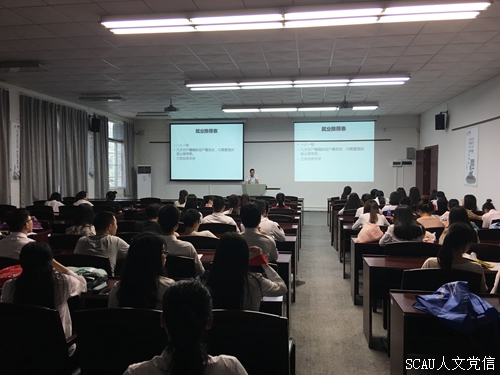 授课老师介绍了我院近三年毕业生就业率、就业特点以及就业发展趋势等,直观地展示了我院近几年应届大学生的就业状况,从就业地域、就业薪酬、就业类型等方面做了介绍。即法学毕业生倾向于前往政法系统从事公务员以及在律所从事律师,中文毕业生在教育系统或机构多从事工作,历史哲学的学生就业也呈多元化,选择考研的也居多。此外,也有大约10%的学生选择出国留学深造。