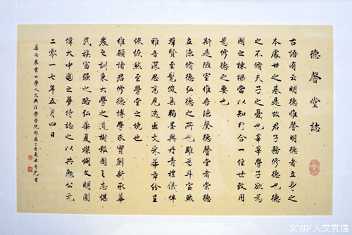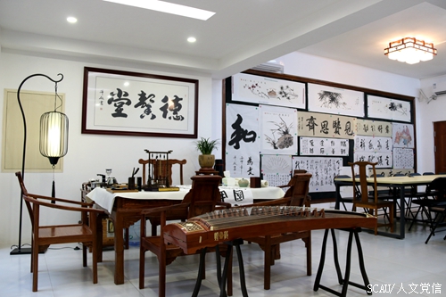 麻雀虽小,五脏俱全。“德馨堂”旨在打造大学生中华礼乐微课堂,内设立翰墨丹青书画区、岭南工艺品展览平台、校园文化纪念品展示区、启林明德讲堂等传统文化传播功能区。