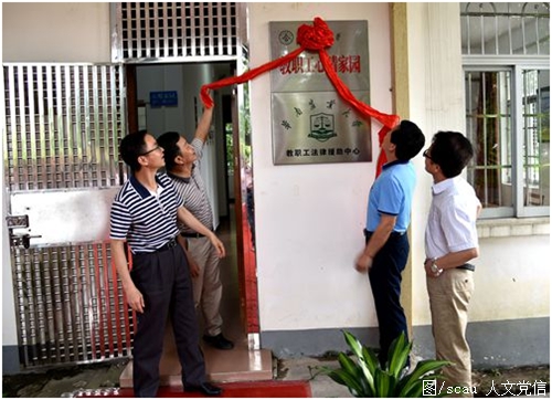 校党委副书记钟仰进、校党委宣传部部长杨志群、华南农业大学校工会常务副主席谭仕林和人文与法学学院院长杨乃良共同为华南农业大学教职工心晴家园揭牌。