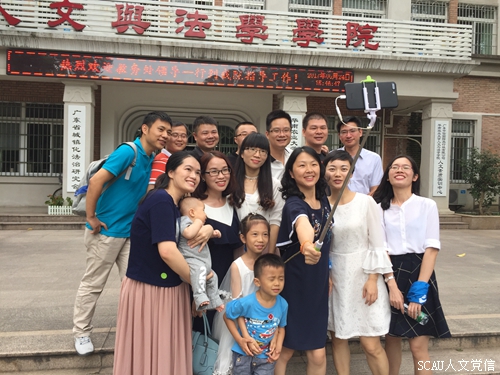 十年之前,他们是对着镜头高喊“毕业快乐”的莘莘人文学子,十年之后,他们是携家带口回到母院感怀象牙塔时光的华农校友。下午两点,人文与法学学院院楼的气氛同室外的夏阳一样热烈,走廊的校友三五成群,指着墙上的毕业照,缅怀当初的青春岁月,14年前上宪法的课室、熟悉的饭堂的味道、魂牵梦绕的母院、关心校友的刘红斌书记、杨乃良院长、陈莉老师,是日种种,催人回想当初在母院成长的点点滴滴,心中对学院以及师长的感激之情不禁更加炽烈。