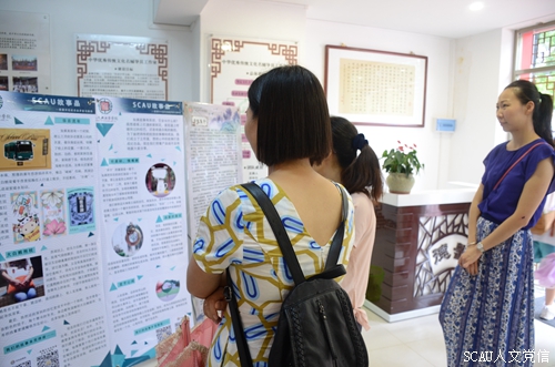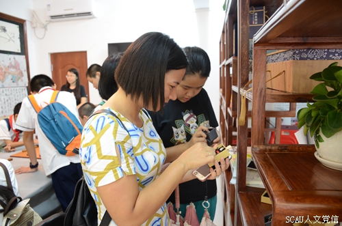 带队老师也感叹于德馨堂的底蕴丰厚,驻足细看我院介绍以及SCAU故事品展架,博古架上精致的校园文化品及其内涵更是令各位老师赞赏不已。现场讲解人员根据华农附小师生的提问,对应作出讲解,德馨堂内其乐融融。