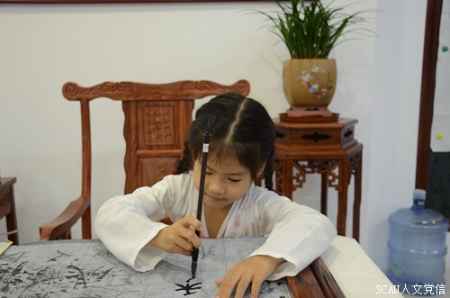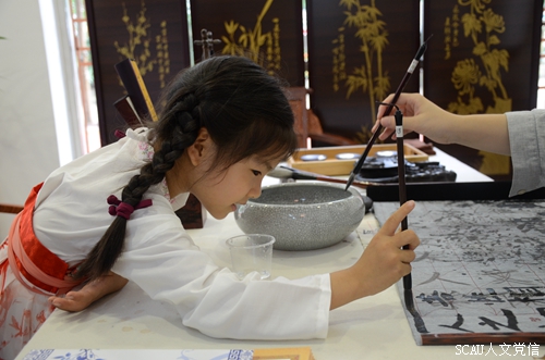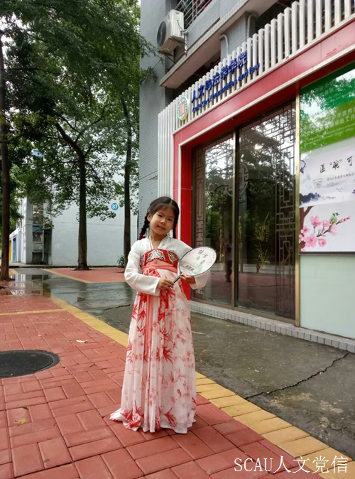 人文与法学学院思政基地——德馨堂古香古色,笔墨书画、棋趣雅韵俱备,华农附小一年级学生魏一霏作为今日的“小堂主”,身着齐胸襦裙,或执笔端坐台前,徜徉书墨世界,或执扇信步堂前,静候“小院士”光临。