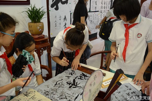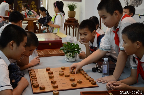 “小院士”行至德馨堂前,不禁发出惊叹,迫不及待涌至书台前、棋盘边,热烈讨论,气氛热闹。书画台前,各执一笔,笔锋游走,字体或平直方正、或圆润流畅,稍显稚嫩但充满朝气。书画墙上的笔走龙蛇、行云流水的作品更是吸引了“小院士”的关注,使之不禁安静下来,流连欣赏。