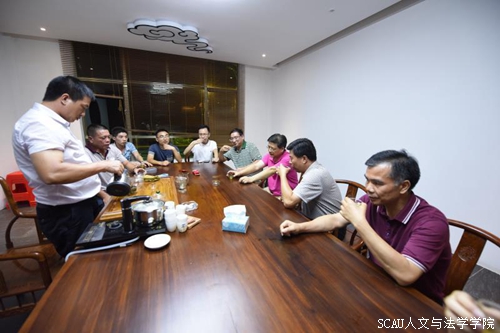 午餐后,调研组驱车一小时来到嘉应学院客家文化研究所,受到副所长肖文评教授的热情接待。在肖教授的带领下调研组参观所内收藏的客家文物以及文献资料,并与肖教授就客家文献、文物的收集与整理,以及客家传统文化保护等方面进行了探讨和交流。肖教授还向调研组赠送《客家村落》、《客家风俗》等著作。接着,调研组一行又起驱车至梅县区雁洋镇考察阴那山千亩茶山,了解茶叶种植历史和品种特色。返城时,调研组还顺道到叶剑英故居参观学习。