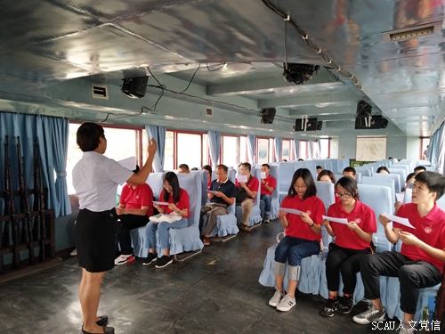 在那恒村那恒码头,寻根团一行人在田东县县委党校徐老师的专业讲解下,详细了解了那恒农民运动的蓬勃发展历史,以及田东人民参加百色起义、建立苏维埃政府、参军北上转战千里、不屈不挠坚持革命斗争的光辉历程。此后,寻根团一行人沿着当年邓小平同志“挺进右江”的足迹,从那恒码头乘坐“红军号”前往二牙码头。在行船途中,大家听取讲解员关于邓小平同志“挺进右江” 、邓小平同志和张云逸同志在平马胜利会师的历史背景,并观看《百色起义》视频影像片段,还集体学唱红色歌曲《共产党领导真正确》。