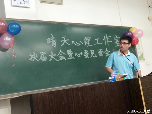 2017年10月13日晚,人文晴天心理工作室于教五c栋401举办人文晴天心理工作室换届大会暨心委见面会。出席本次大会的有指导老师关磊老师,学校阳光团队负责人、学院团委学生会、红十字会、党委信息中心,党务工作室、勤耘勤工助学中心、党委职业规划和就业指导中心、艺术团等各学院组织负责人,2017级心委以及晴天往届成员。
