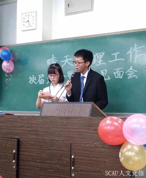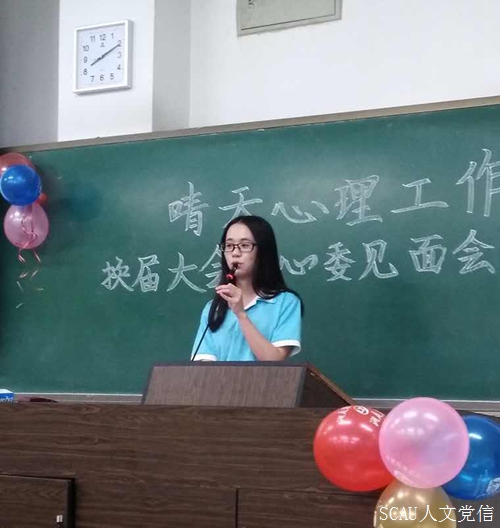 大会主持人对心委发表致辞,在感谢心委在过去一年恪尽职守,为学院学生心理健康工作作出贡献的同时,也希望心委们在新的一年里能充当班级同学的知心伙伴,支持与配合晴天心理工作室落实学院学生心理健康工作。